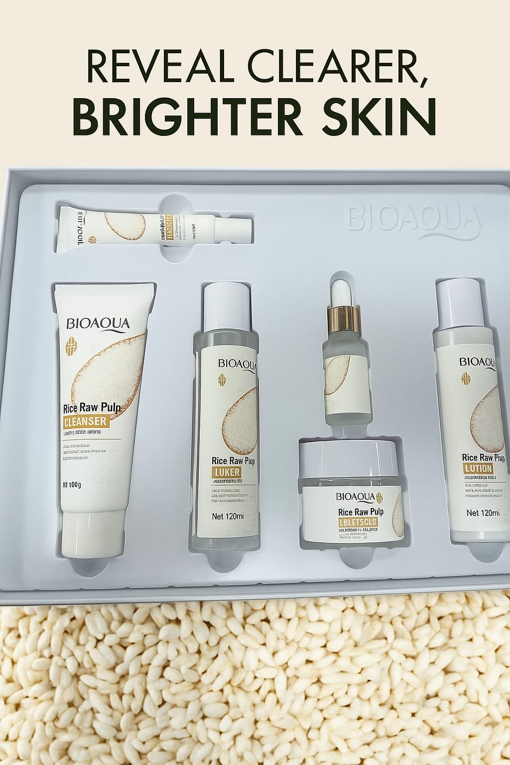 El set BIOAQUA Rice Raw Pulp es una rutina completa de cuidado de la piel diseñada para iluminar, hidratar y suavizar la textura del rostro. Enriquecido con extracto de arroz, conocido por sus propiedades para aclarar el tono de la piel y refinar los poros, este kit ofrece una solución integral para lograr un cutis visiblemente más claro, uniforme y radiante.
