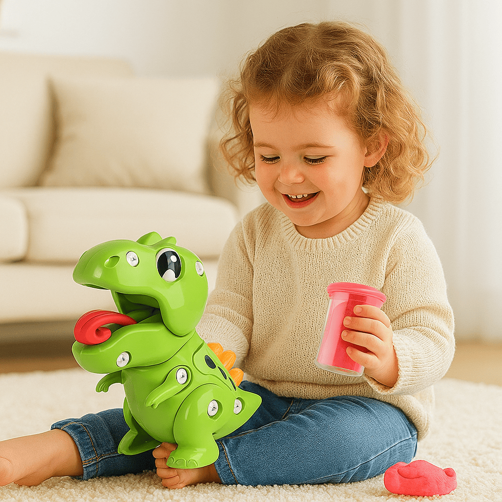 Un divertido dinosaurio verde para armar y desarmar que incluye plastilina, ideal para que los niños creen formas, decoren su T-Rex y desarrollen su creatividad mientras juegan en un mundo jurásico lleno de imaginación.