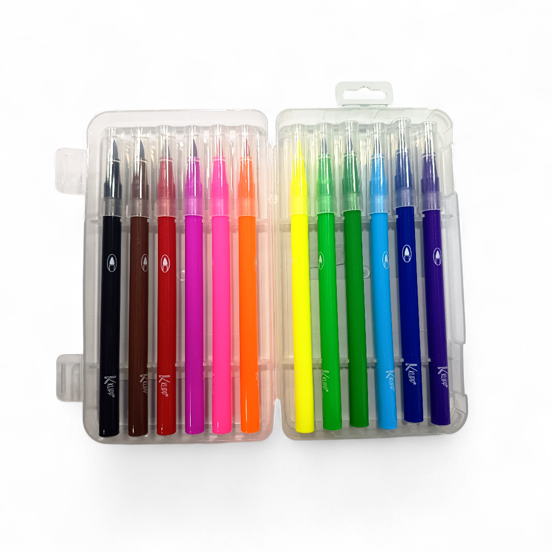 Set de *12 marcadores de acuarela* (watercolor pens) en un estuche plástico transparente dividido en dos secciones. Los marcadores tienen cuerpos de colores sólidos con el nombre “Kuwar” impreso en blanco. Cada marcador incluye: