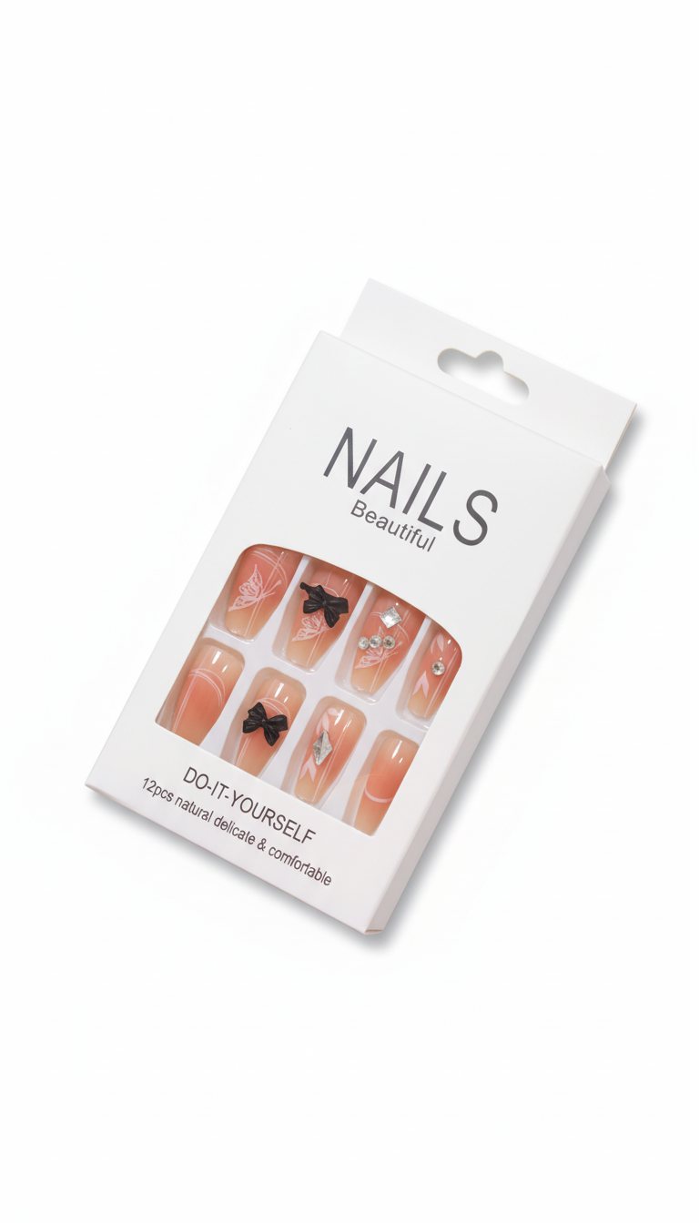 🎀 Diseños elegantes y modernos: base nude degradada con mariposas, lazos negros y pedrería brillante.